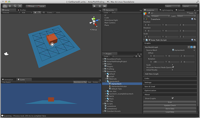 Press Scan (or Cmd+Alt+S, Ctrl+Alt+S on Windows). If everything goes well, you will see the mesh in the scene view. However, you might need to change the import scale on the mesh (in the import settings for the mesh asset). Usually, Unity defaults to an import scale of 0.01; change this to 1. Also, depending on the axis settings your modeling tool uses, you might need to rotate it. You can rotate it directly in the navmesh graph settings. When importing from Blender with default settings, rotating with (-90, 0, 0) will give it the correct rotation.