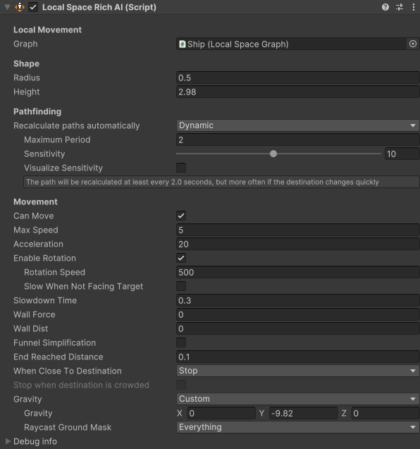 4. The LocalSpaceGraph component is added to the ship GameObject. This will track the initial position of the ship, and provide the means for the agent to translate back and forth between the ship's coordinate system and the world coordinate system.