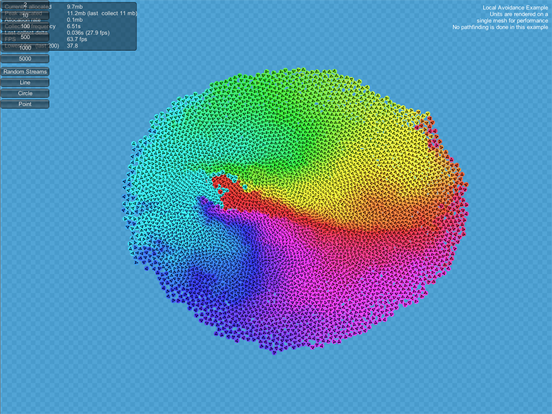 So how fast is this system then, you might wonder. It is very high performance. Especially if you take into account the fact that a local avoidance simulation does not need to run at a very high fps, that's just a waste of CPU cycles because the quality won't improve much. I have been able to simulate 5000 agents at a good fps on my computer (i7 processor). The local avoidance simulation ran at about 10 fps and the game ran at 50-100 fps mostly, with a lowest fps of around 30-40. The visualization for this simulation was done simply by creating a mesh which held one quad for each agent. The reason for this is that at such high numbers, creating a GameObject for every agent is really slow, just creating that many game objects took something like 10 seconds when I tested. The agents were setup in a circle and trying to reach their antipodal points. So it was basically as crowded as it can get.