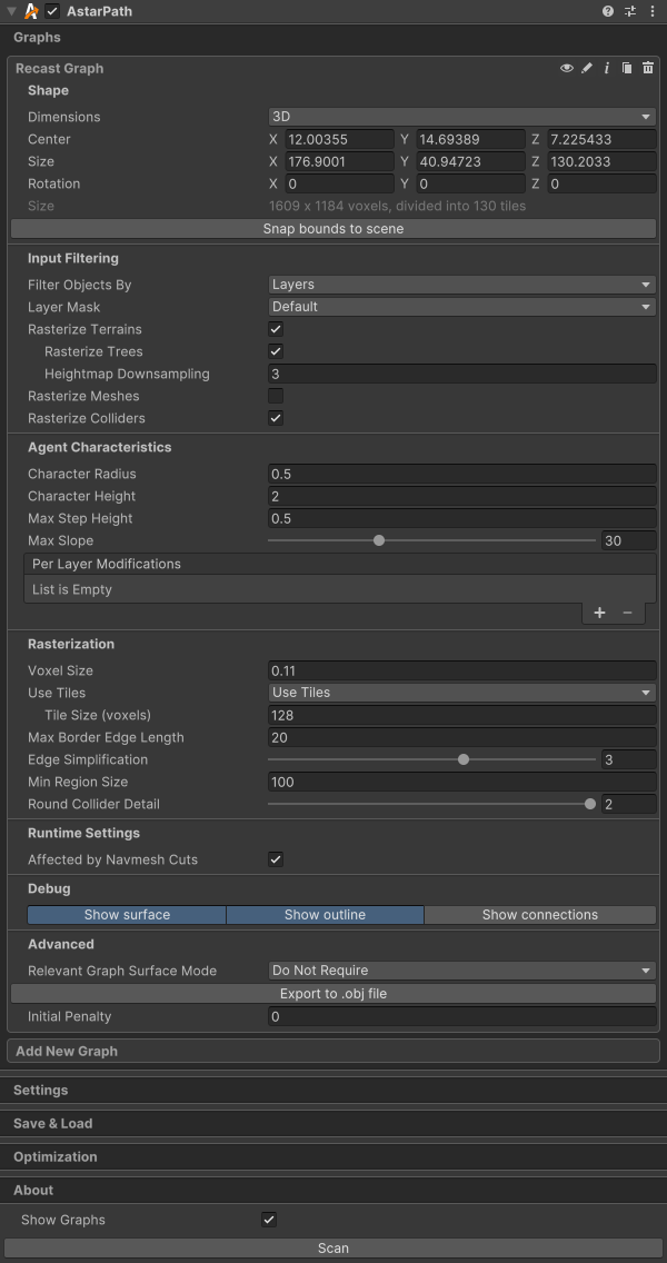 The graph has been changed to rasterize colliders, instead of meshes, which is the default. This is primarily because the bridge is always visible, but the animation on it enables and disables a collider to toggle its traversability.