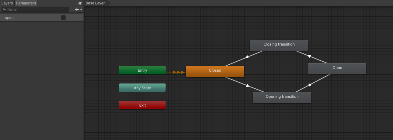 The door's animator can be in either the open state or the closed state. If the animator detects a change in the "open" parameter, it will play the appropriate transition animation and move to the other state. There is also a NavmeshCut covering the opening. When the opening animation starts, this navmesh cut will be disabled, which allows the agent to move through the door.