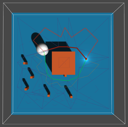 As you see in the above image, the navmesh does not have equally sized nodes, but nodes can be as large or as small as you want them to be. The end result is that navmeshes can more accurately describe the environment and are smaller because they do not need to waste a large number of nodes on empty areas. Because they are smaller, they are also usually faster to perform pathfinding on. Also, they can represent multilayered environments as opposed to normal grid graphs (but this is a feature of the LayeredGridGraph available in the pro version).