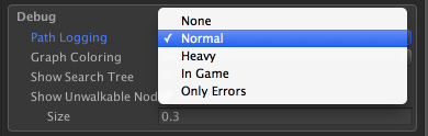 Use less debugging to improve performance (a bit) or just to get rid of the Console spam. Use more debugging (heavy) if you want more information about what the pathfinding scripts are doing. The InGame option will display the latest path log using in-game GUI.