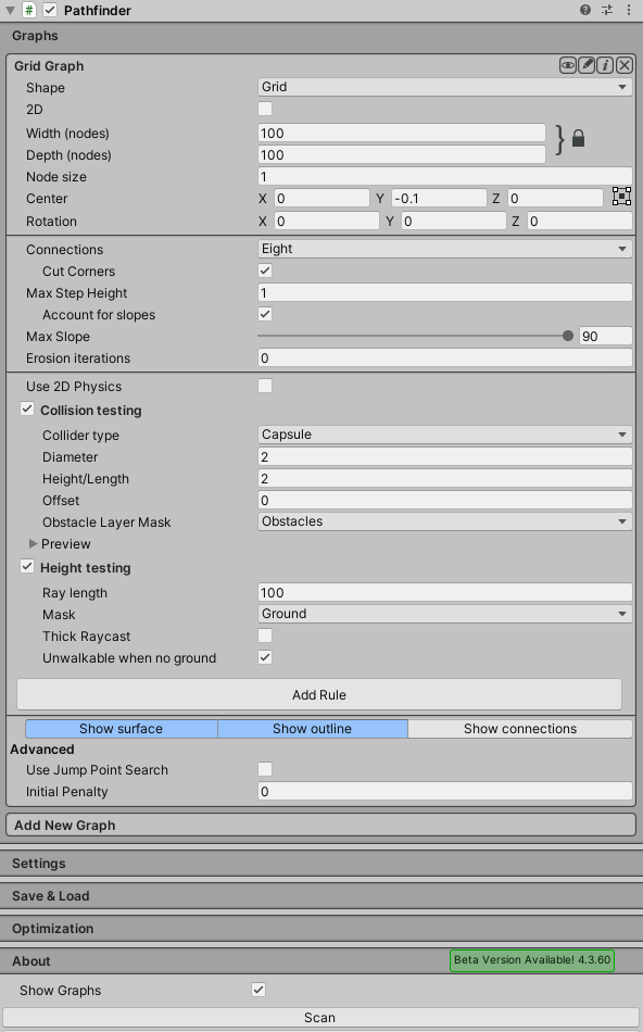 The AstarPath component holds all the graph data in a scene. It follows the singleton pattern, so there should only be one such component in a scene. It may contain one or many graphs, of the same or different types. Each graph, in turn, contains and manages all its nodes (of which there may be many, sometimes up to millions).