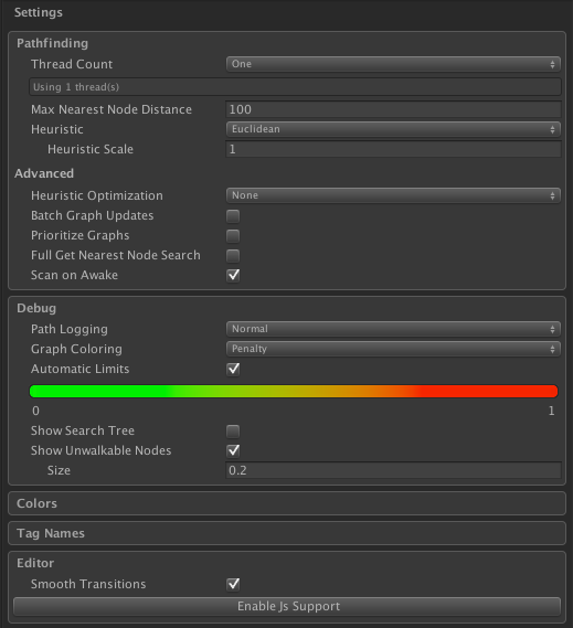 There is also the 'Show Graphs' toggle which enables or disables the graphs from being rendered in the scene view, and lastly there is the 'Scan' button which recalculates all graphs. In the editor graphs are not scanned unless you press this button (or use the keyboard shortcut, see Keyboard Shortcuts).
