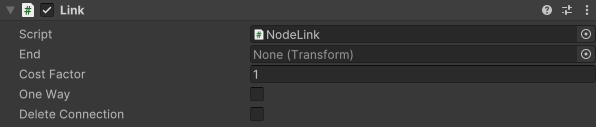 If you have a point graph where you want to either add a connection, remove an existing connection or perhaps change the cost of some connection, then you can use the NodeLink component. Point graphs are generally created from a collection of GameObjects. You can add the NodeLink component to one node and then set the target to another node. By changing the options, the component can then either add a new connection between those two nodes, remove an already existing connection (if one exists) or change the cost of the connection between them. These new connections are identical to the ones created by the point graph originally.