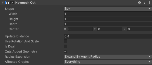 The NavmeshCut component uses a 2D shape to cut the navmesh with. This shape can be produced by either one of the built-in 2D shapes (rectangle/circle) or one of the 3D shapes (cube/sphere/capsule) which will be projected down to a 2D shape when cutting happens. You can also specify a custom 2D mesh to use as a cut.