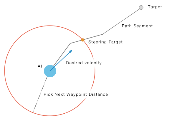 Below is an image illustrating several variables that are exposed by this class (pickNextWaypointDist, steeringTarget, desiredVelocity)