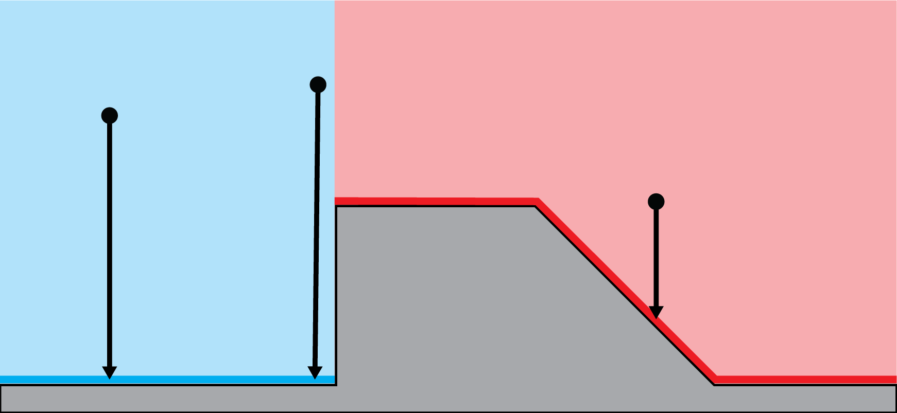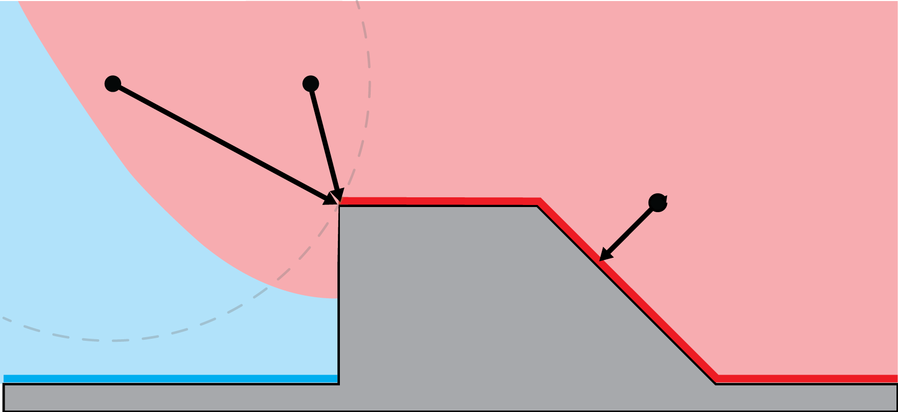 The default distance metric is euclidean distance. This is the same as the distance you would measure in 3D space. Shown in the image above are two parts of a navmesh in a side view. One part is colored blue, and one part colored red. Both are walkable. In the background you can see if points are closer to the blue part, or to the red part. You can also see a few query points in black, which show the closest point on the navmesh to that point. The dashed circle around the first query point shows all points which are at the same distance from the query point.