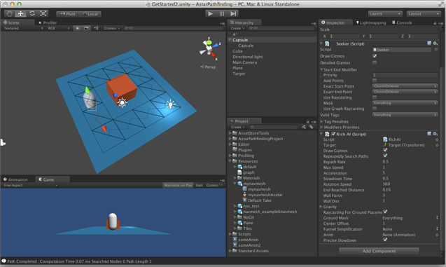 In the previous tutorial, we wrote a simple script for moving a character around. We could use the same script, but to get nicer movement I will introduce an included component which gives very nice movement on navmeshes (specifically navmeshes). It is called RichAI. Create a new GameObject and attach the RichAI component to it. It will automatically attach a Seeker. For visualization purposes, add a Capsule object as a child object to root. Move the capsule one unit up, so that the root GameObject will have its pivot point at the capsule's base; the RichAI script assumes that the pivot is at the feet of the character.