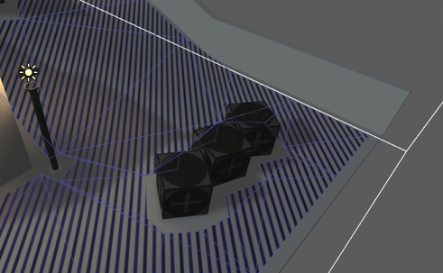 As you see in the above image, the navmesh does not have equally sized nodes, but nodes can be as large or as small as you want them to be. The end result is that navmeshes can more accurately describe the environment and are smaller because they do not need to waste a large number of nodes on empty areas. Because they are smaller, they are also usually faster to perform pathfinding on. Also, they can represent multilayered environments as opposed to normal grid graphs (but this is a feature of the LayeredGridGraph available in the pro version).
