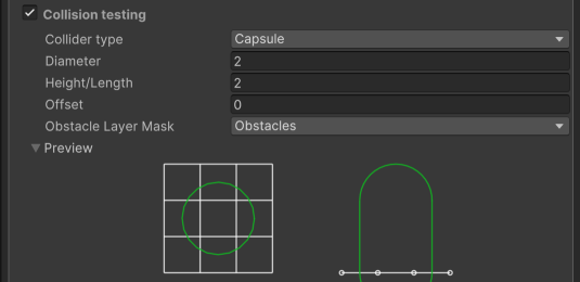 But let's assume, for our scene, that we want the cubes to be treated as obstacles, so that the agent cannot even walk on them. We can do this by changing the Collision Testing settings.