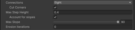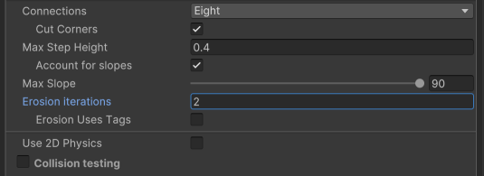 All ledges, or unwalkable nodes, will now be eroded by 2 nodes, creating more unwalkable nodes around them.
