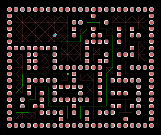 Below are two images showing a path with the smooth modifier turned off first and then on. Note that the smoothed path cuts the corners a bit; this can be a problem with the smooth modifier since it does not take world geometry into account when smoothing. For variable documentation, look at the Simple Smooth Modifier documentation