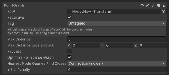 The point graph takes a Transform object as "root", this Transform will be searched for child objects, every child object will be treated as a node. If recursive is enabled, it will also search the child objects of the children recursively. It will then check if any connections between the nodes can be made, first it will check if the distance between the nodes isn't too large (maxDistance) and then it will check if the axis aligned distance isn't too high. The axis aligned distance, named limits, is useful because usually an AI cannot climb very high, but linking nodes far away from each other, but on the same Y level should still be possible. limits and maxDistance are treated as being set to infinity if they are set to 0 (zero).