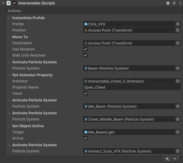 These chests use the Interactable component to implement a simple state machine which controls the animation of the chest and movement of the character.