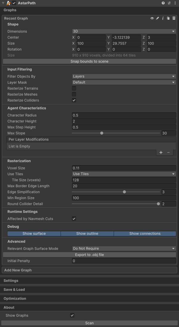 The graph used in this scene is a RecastGraph. A recast graph has been chosen because: