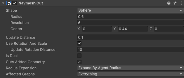 The navmesh cut on the box is configured as a sphere with a radius that approximates the cube. With a resolution of 6, the navmesh cut will remove a hexagonal shape from the navmesh. It could equally well have been configured using the "Box" shape, but the sphere shape is slightly simpler, and the rounded shape leads to nicer movement around the box.