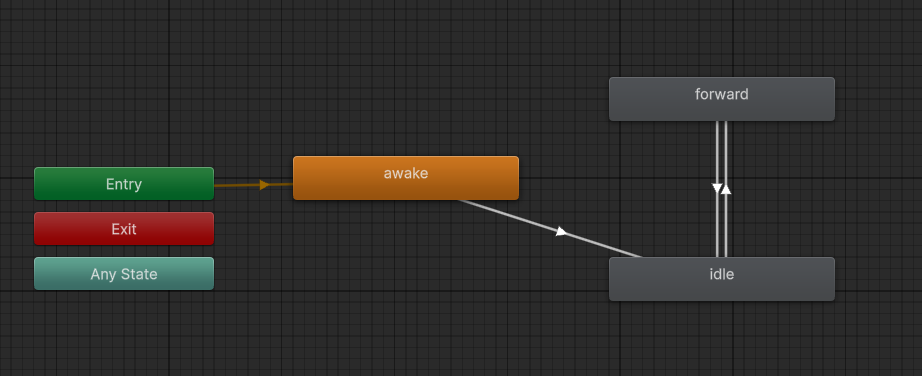 In the animator controller, the root has two states: forward and idle. These are two animation clips that are transitioned between, depending on if the NormalizedSpeed is high enough. The forward animation clip is also configured to multiply its speed by the NormalizedSpeed parameter, so that the animation will play faster or slower depending on how fast the agent is moving.