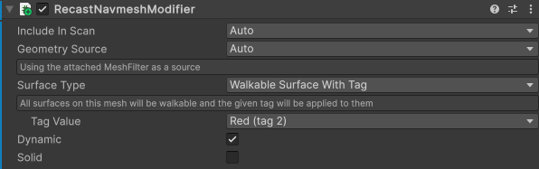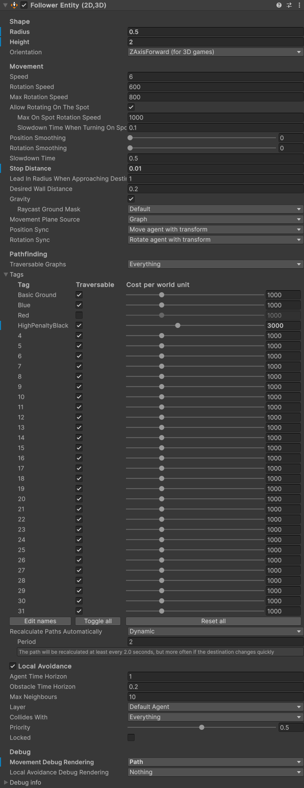 The way this is configured is that on the FollowerEntity component, under the "Tags" foldout, the "BlackHighPenalty" tag has been given a high penalty for the blue agent. The ground is tagged with the "BlackHighPenalty" tag using the RecastNavmeshModifier component, similar to how it was done in the previous section.